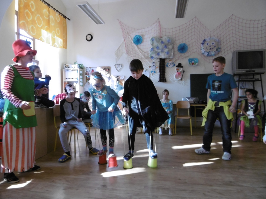 Posléze se děti připravovaly na karneval a společně jsme si vytvářeli klauny k výzdobě školy a karnevalové škrabošky zvířátek. Karneval se konal 28. 2. a byl zahájen přehlídkou masek. Následovala spousta různorodých soutěží. Medaile, diplomy a opět sladká odměna čekala na každého. Odpoledne bylo zakončeno diskotékou s balónky.