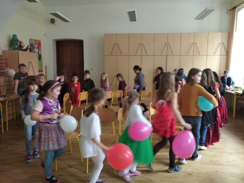 Čas v družině byl také pestrý. Nejdříve karneval – děti si přinesly různé masky: princezny, víly, čarodějky, superhrdiny. Po zahájení děti soutěžily a plnily různé úkoly. Slalom s míčkem, skoky na jedné noze, prolézačky, hod na cíl, „židličkovaná“ a tanec s balónkem. Všichni si to moc užili. Děti dostaly za odměnu sladkosti a malé dárečky.