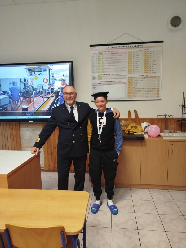 Dne 21. 4. nás navštívil kapitán nákladní lodi, která dopravuje zboží po Evropě. Kapitán Martin Rychlý kormidluje nákladní loď, která má na délku 140 m. S nákladem se loď zanoří až 3 metry pod vodu. V posádce jsou dohromady 4 lidé. Jeho plavba trvá 1 měsíc. Na západě je víc vodních toků než silnic a dálnic u nás. Týden trvá převést jeden náklad. Trvá několik let, než se můžeme stát kapitánem. Při zkouškách musejí zvládat náročné stresové situace. Děkujeme za návštěvu.